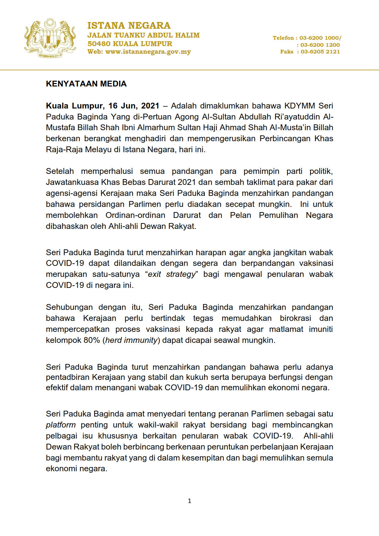 Kenyataan itu dibuat berikutan siri pertemuan dari 9 Jun hingga 15 Jun antara Yang di-Pertuan Agong Sultan Abdullah Ahmad Shah dan 18 pemimpin politik, yang berakhir dengan sidang khas Raja-Raja Melayu hari ini.