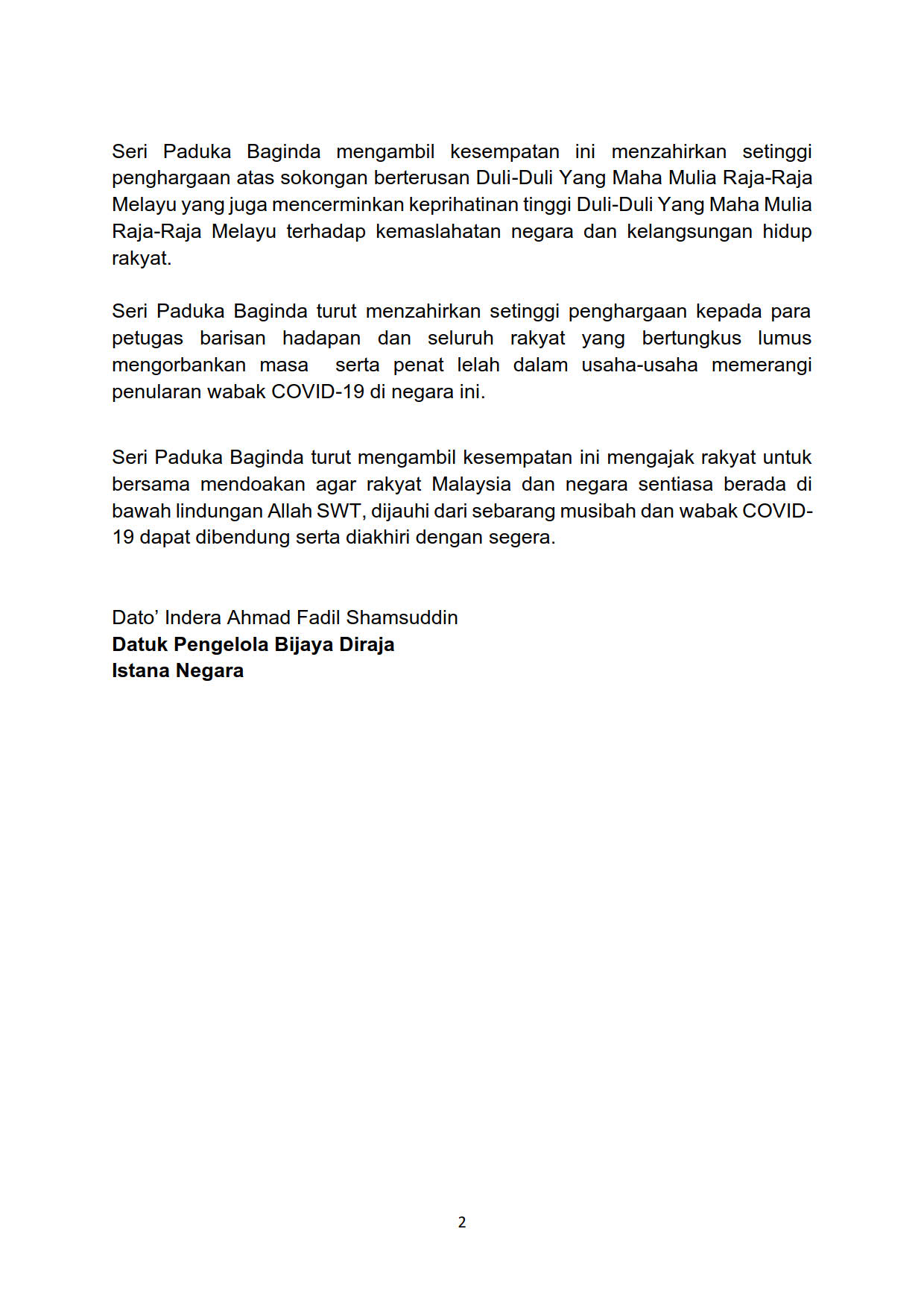 “Seri Paduka Baginda amat menyedari tentang peranan Parlimen sebagai satu platform penting untuk wakil-wakil rakyat bersidang bagi membincangkan pelbagai isu khususnya berkaitan penularan wabak Covid-19.